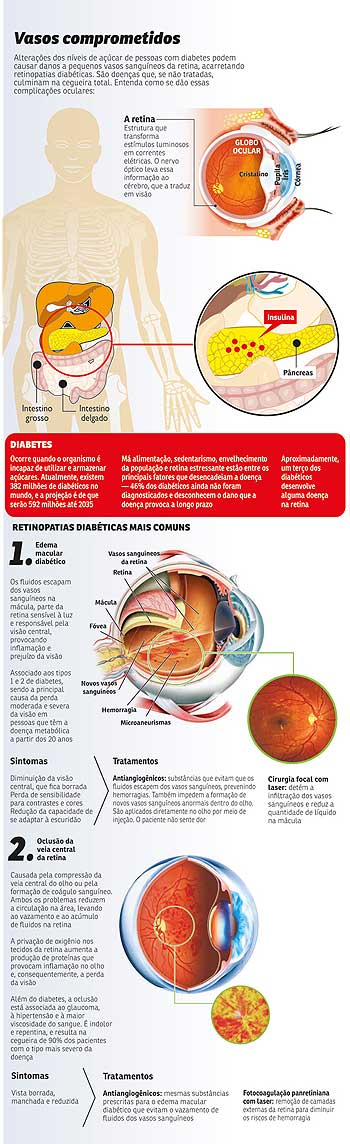 Injeção reverte cegueira causada por diabetesA epidemia do diabetes, ao contrário de outros surtos, é silenciosa. Pior do que isso, costuma ser aliada de doenças incapacitantes, como a retinopatia diabética (RD), principal causa de perda de visão entre pessoas com idade ativa. Sorrateira, a RD revela-se em estado avançado, quando a cegueira é iminente. Há, entretanto, uma boa notícia: dá para controlar — e até mesmo reverter — a complicação com uma substância que atua diretamente nos olhos. Apresentada neste mês em um congresso médico na capital da Colômbia, a estratégia, aliada à prevenção, pode evitar que muitos adultos percam a capacidade de enxergar.